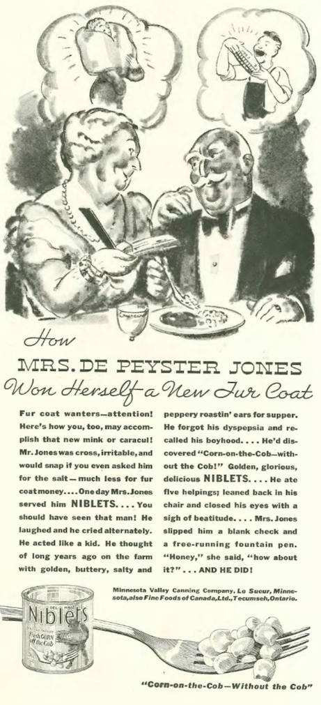 …the folks at Minnesota Valley Canning Company continued the theme of a rich man returning to his humble roots via canned Green Giant vegetables…here the man is brought to tears over “Niblets”…