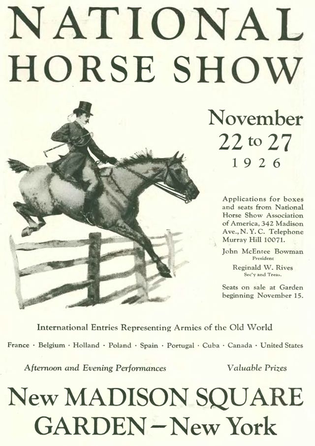 As for other sports, The New Yorker also offered extensive coverage of tennis, golf, and polo in its issues. And there would also be rowing, boat and auto racing, and steeplechase events such as National Horse Show at Madison Square Garden. An advertisement promoting that event appeared on the inside back cover: