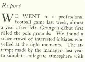 The “other” game–professional football–was still in its infancy, and the editors of “The Talk of Town” made it clear that the college atmosphere was more to their liking. It is interesting that even today when fans compare college to pro football, the same observations are made: