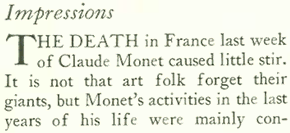 The death of artist Claude Monet prompted the editors of the New Yorker’s “Talk of the Town” to speculate on the true origins of the “Impressionist” movement of the late 19th century.