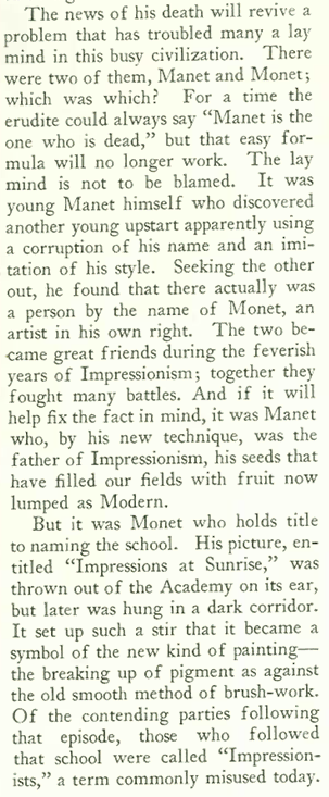 The editors also used the occasion to clear up the confusion (in the lay mind) between Édouard Manet and Monet, identifying them not only as two distinct persons but also crediting the former with the founding of the Impressionism technique while giving Claude his due for actually giving it a name: