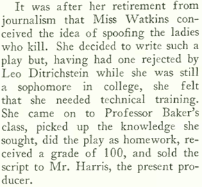 Watkins transformed a brief career as a Chicago Tribune crime reporter into her Broadway success, thanks to her fondness for writing about murderers: