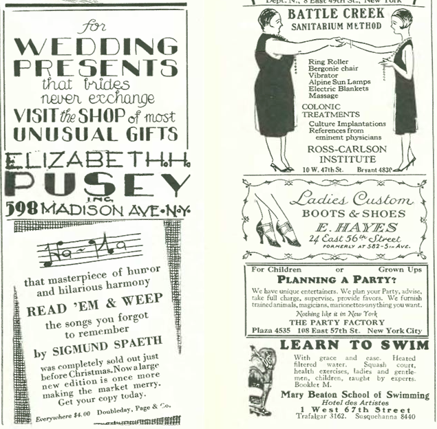Up to now I’ve been posting images of often lavish ads featured mostly in the first sections of the magazine and on the front and back inside covers, but there were other, less expensive (and less artful) ads sprinkled in the back pages of the magazine, a tradition that continues to this day: