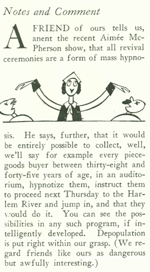 The famous 1920s evangelist Aimee Semple McPherson had been holding a series of revival meetings in New York, which were often (and derisively) noted by the New Yorker editors. In the previous issue “Talk of the Town” observed: