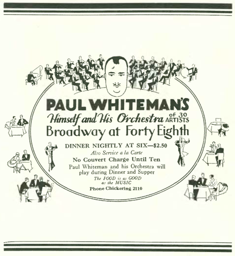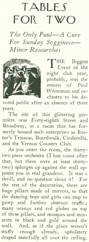 Even Lois Long, who seemed to be growing bored with New York nightlife, found reason to celebrate Whiteman in this column that appeared alongside the ad: