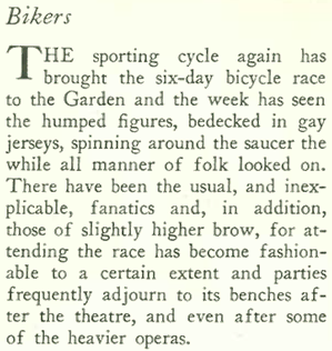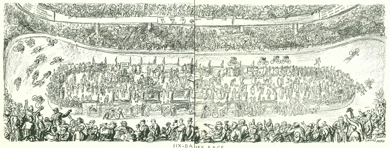 In other diversions, bicycle racing had come to Madison Square Garden, as noted in “Talk of the Town” with an illustration by Reginald Marsh: