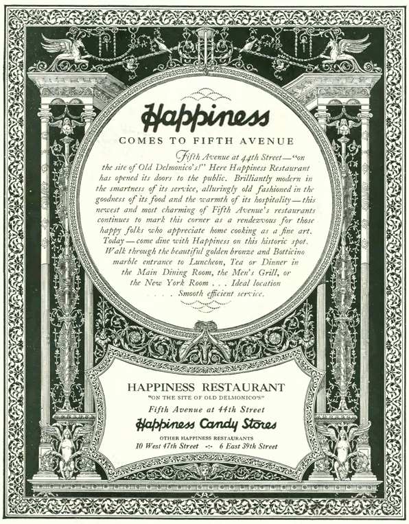 The restaurant was operated by the Happiness Candy Stores chain, which according to the ad also operated restaurants in two other locations in the city. The restaurants must have been short-lived, as I could find no record of them apart from the ads.