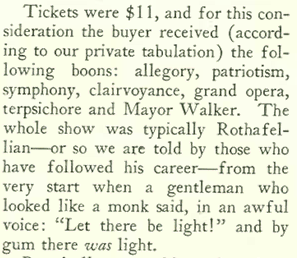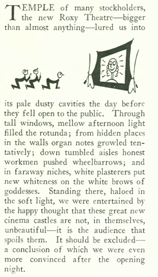 “The Talk of the Town” described the Roxy in similar dispassionate terms, tossing a wet blanket not on the film but rather on the rude, gawking masses who shelled out eleven bucks apiece (equivalent to $150 today) for a seat on opening night:
