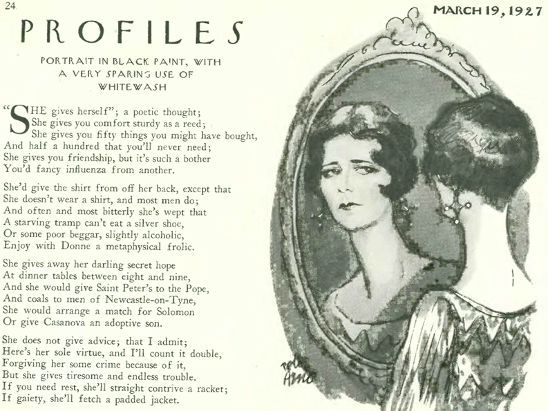 The magazine took an unusual approach to its “Profile” section by featuring an autobiographical profile of poet Elinor Wylie in verse, a portion of which is shown below with an illustration by Peter Arno: