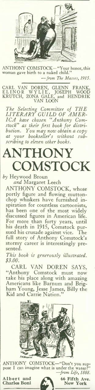 Morality-themed books got the attention of New Yorker book reviewer Ernest Boyd (pen name “Alceste), who devoted considerable ink to Anthony Comstock: Roundsman of the Lord by Heywood Broun and Margaret Leech (both of Algonquin Round Table fame). Comstock was a United States Postal Inspector and politician known for the “Comstock Law,” which sought to censor materials he considered indecent and obscene. That included birth control information, which led to famous clashes between Comstock and family planning advocate Margaret Sanger.