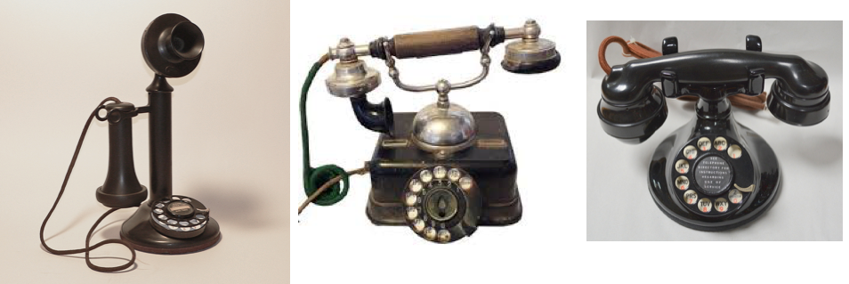 FRANCOPHONE…Trendy New Yorkers were switching from their old reliable candlestick telephones (left) to “French-style” phones (center) that were common throughout Europe. Western Electric answered their call with a sleek American version in 1928, right.