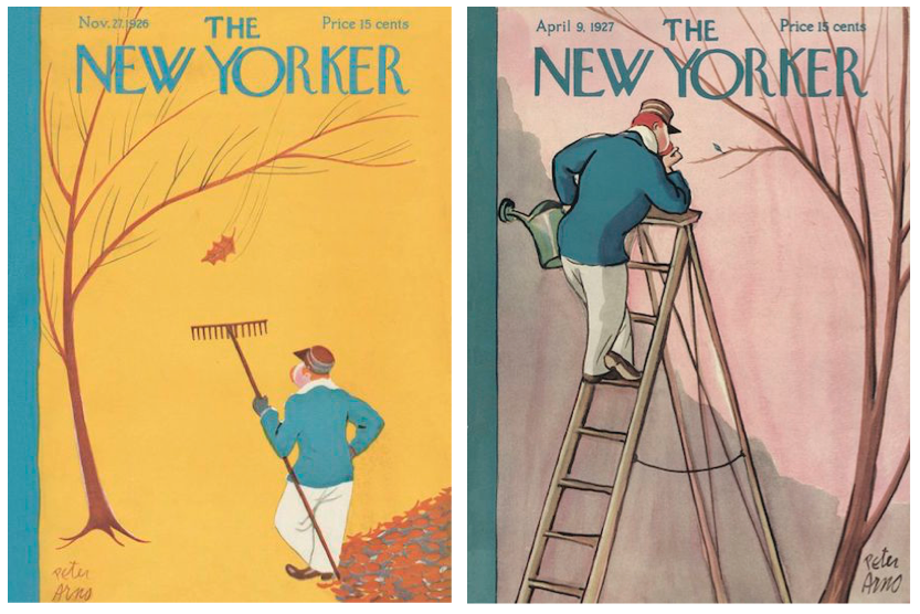 The April 9, 1927 issue featured the second of Peter Arno’s 99 covers for the New Yorker. His first cover appeared eighteen issues earlier (Nov. 22, 1926) and featured the same gardener, but this time he was inspecting a newly budded leaf rather than the last one to fall: