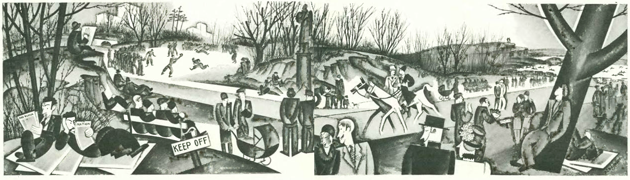 And finally, in celebration of spring, Constantin Alajalov illustrated an April day in Central Park, which was featured in a two-page spread in “Talk of the Town.”