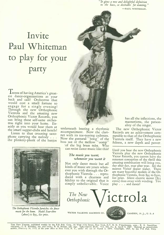 The folks at Victor Talking Machines played on Whiteman’s fame with this advertisement for their latest “Orthophonic” Victrola. Although it was the first consumer phonograph designed specifically to play “electrically” recorded discs and was recognized as a major step forward in sound reproduction, the claim that the machine would reproduce sounds “exactly as you would hear them at the smart supper clubs” seemed a little far-fetched.
