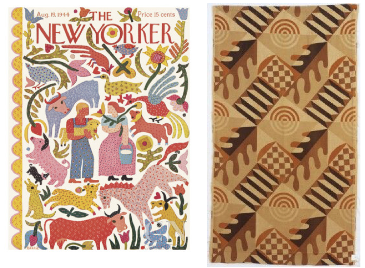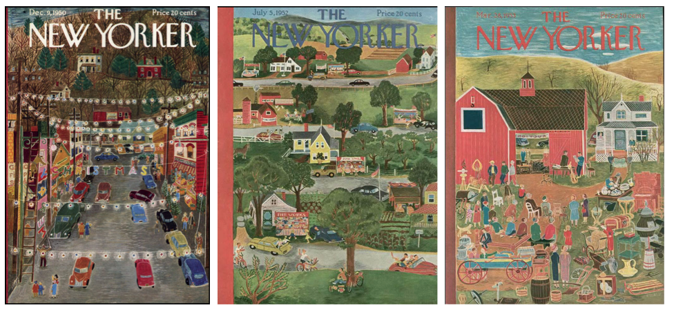 Ilonka Karasz’s first and last covers for The New Yorker: April 4, 1925 (left) and Oct. 22, 1973.Many of Karasz’s covers were scenes of Americana—small towns, villages and farms. From left to right, covers from Dec. 9, 1950, July 5, 1952, and March 28, 1953.Ilonka Karasz, circa 1920s. At right, an illustration from her 1949 book, The Twelve Days of Christmas. (Wikipedia/Harper and Row)TEXTILE ARTIST…Karasz’s cover design for the Aug. 19, 1944 New Yorker (left), and an oak leaf-pattern textile in Mohair, 1928 (RISD)WALLPAPER…“Wisconsin,” a mid-century wallpaper design by Ilonka Karasz (left), and her “Ducks & Grasses” wallpaper from 1948. (Pinterest)Candlestick and small bowl by Karasz from a set designed for Paye & Baker, 1928. (Cooper Hewitt)Karasz’s mahogany desk from 1928 (Minneapolis Institute of Arts)