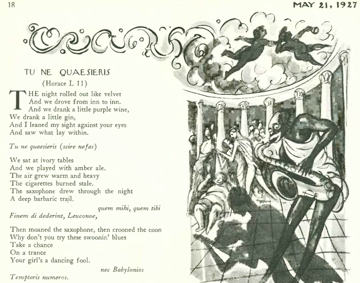 Here is a sampling of de Miskey’s spot illustrations for “Talk” in the July 9 and July 16, 1927 issues…