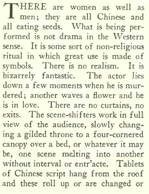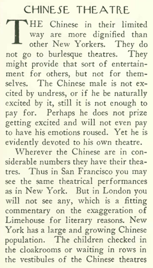 The August 6 issue also featured this strange little review in “Talk” about the popularity (or fad) of attending Chinese theater. Note how the writer described it as an exotic curiosity, as though the Chinese actors were as unknowable as Martians. I suppose it didn’t occur to the writer that you could actually speak to these performers, and have them explain the meanings of the various rituals.