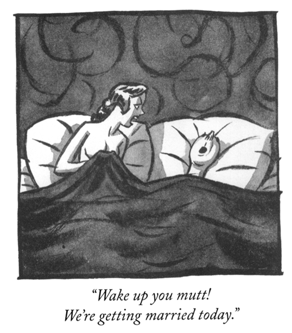 Schwartz suggests that Arno drew on personal experience when in 1930 he published Peter Arno’s Hullabaloo, a “collection of cartoons that included a set of racy drawings featuring a dashing couple much like himself and Long. In one, a nude woman, in bed, yells at her sleeping lover: ‘Wake up, you mutt! We’re getting married to-day.'”