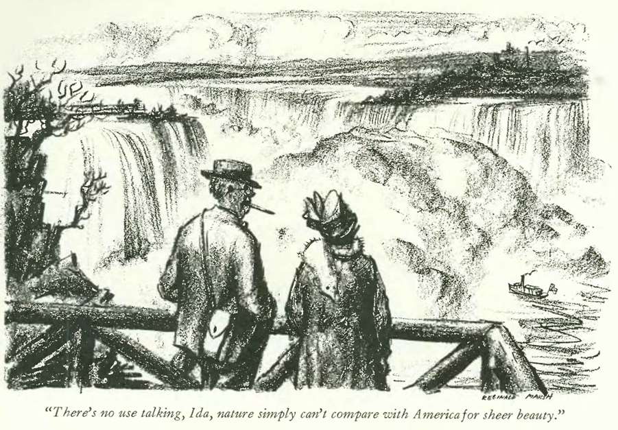 …and a cartoon by Reginald Marsh, portraying a distinctly American view of the grandeur of Niagara Falls…