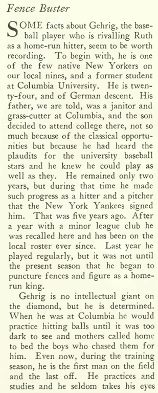 …and over in “The Talk of the Town” section the editors looked at another Yankee slugger, Lou Gehrig, who besides his hitting ability was Ruth’s opposite…
