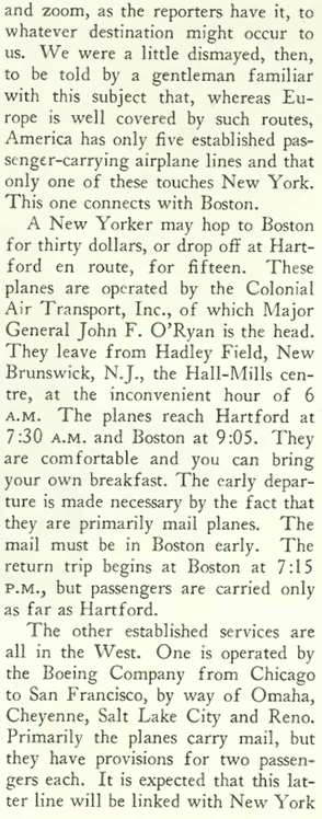 HUMBLE BEGINNINGS…On April 15, 1927, Colonial Air Transport (a predecessor of American Airlines) began passenger service between Boston and New York City. (Boston Globe)SORRY, NO WI-FI…National Air Transport, a predecessor of United Airlines and a prime mail carrier, brought the Travelair 5000 to their minimal fleet in 1927 to add passenger revenue to its Midwestern and Western hops that linked Chicago, Omaha, Cheyenne, Salt Lake City, Reno and San Francisco. (traveler.com)
