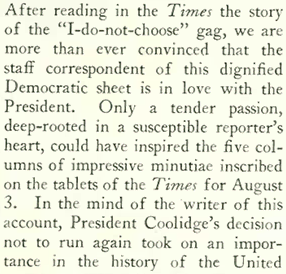 Coolidge was summering in Black Hills when he gave his secretary, Everett Sanders, a piece of paper that read, “I do not choose to run for president in 1928.” Sanders then scheduled a midday press conference for August 2, 1927. At 11:30 a.m., Coolidge cut out strips of paper with this statement–I do not choose to run—and at the conference handed each reporter one of the strips. Coolidge offered no further information, and only remarked, “There will be nothing more from this office today.” This led to considerable debate among the press as to intentions of the president. TheNew Yorker’s “Talk of the Town” mused…