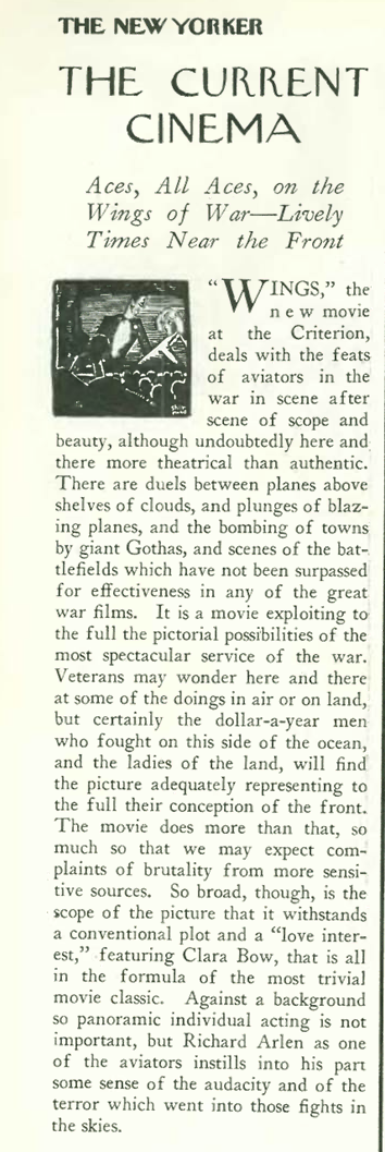 The First Academy Award for Best Picture went to Wings, a romantic action-war picture directed by William Wellman and featuring Paramount’s biggest star at the time, the “It Girl” Clara Bow and a young Gary Cooper in a role that would launch his Hollywood career.