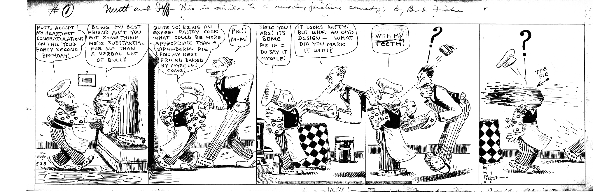 Fisher began his career as a sports cartoonist for the San Francisco Chronicle and started his strip about “two mismatched tinhorns” in 1907. It went into syndication the following year. Mutt and Jeff, originally titled A. Mutt, is regarded as the first American newspaper cartoon published as a strip of panels, making it the first “comic strip.”