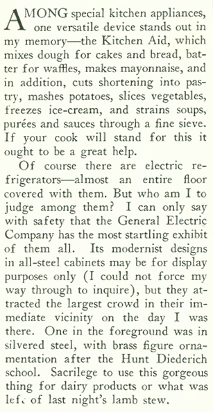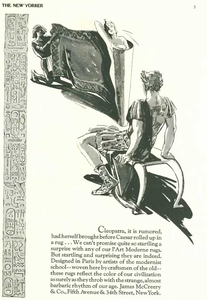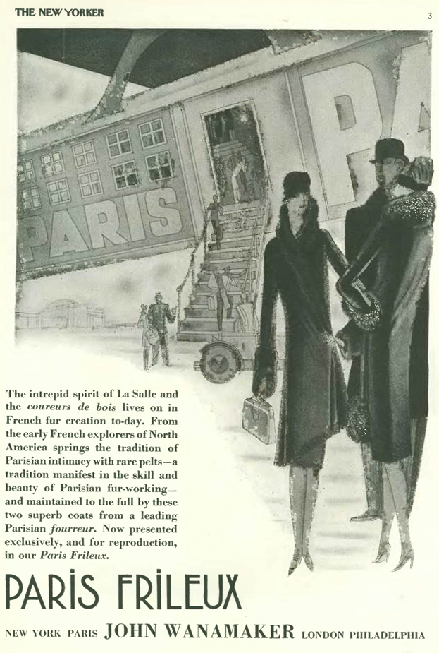 The Nov. 19 issue also featured this strange advertisement from the famed Wanamaker department store. Strange mainly because of the illustration, which features a fashionable woman departing a fanciful aircraft studded with mullioned windows(!) and a stairway that stretches to improbable depths…oh, and in case the reader might miss the snob appeal associated with French furs, the words Paris, Parisian or French are featured ten times…