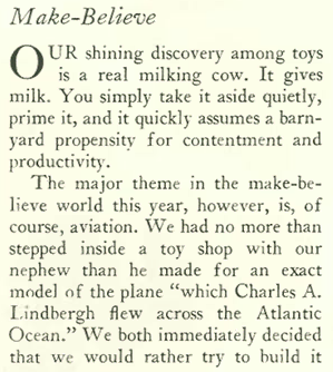 Thanks to the race to fly across the Atlantic, toy models of Charles Lindbergh’s Spirit of St. Louis and other planes were in high demand for the Christmas season, according to this item in the Nov. 26, 1927, “Talk of the Town:”
