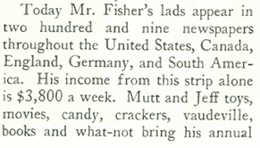 According to John Adcock’s terrific Yesterday’s Papers blog, by 1916 Bud Fisher was the highest paid cartoonist on earth. The New Yorker suggested his annual income was $300,000 (roughly equivalent to more than $4 million today). In addition to the strips, created by Fisher and a team of ghost illustrators/writers, Mutt & Jeff were featured in vaudeville engagements, theatrical shows, animated cartoons, comic books and toys.