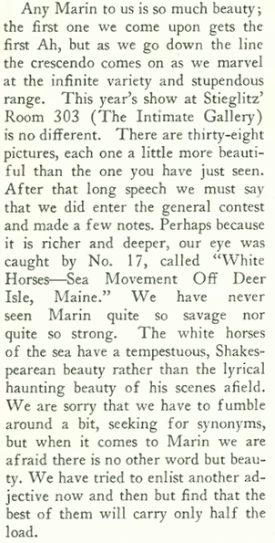 Jumping back to the Nov. 19, 1927 issue, we go from the low art of Bud Fisher to the high art of John Marin featured in “The Art Galleries” section. Art critic Murdock Pemberton wrote: