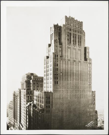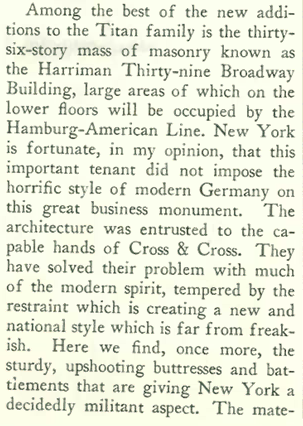 TEN-HUT!…The New Yorker’sGeorge Chappell liked the Harriman Building at 39 Broadway despite its “militant aspect.” Designed by Cross & Cross, it opened in 1928. (Museum of the City of New York)