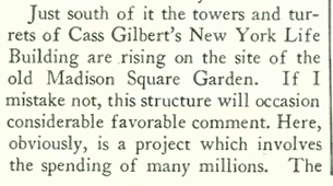 To save the best for last, Chappell also wrote of Cass Gilbert’s landmark New York Life Building, rising on the site of the old Madison Square Garden…