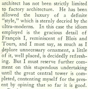 It’s seemed a bit of an “about face” for New Yorker architecture critic George S. Chappell to write of the “horrific style of modern Germany” after previously writing admiringly of the Bauhaus movement and “International Style” promulgated by Le Corbusier. Chappell’s column “The Sky Line” included this subhead, “German Atrocities Neatly Escaped.” In a few years “German Atrocities” would refer to something very different…