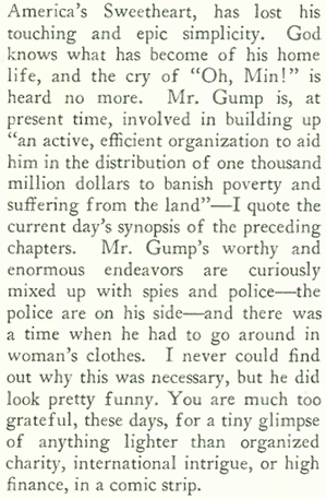 In her column, “Reading and Writing,” Dorothy Parker (writing under the pen name “Constant Reader”) lamented the fact that the comic strips were abandoning simple, light horseplay in favor of “melodramas.” Apparently even Andy Gump wasn’t exempt: