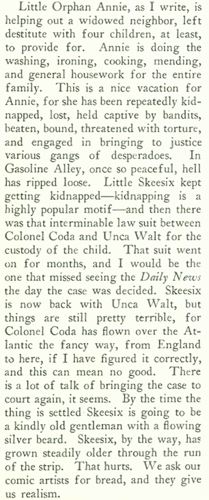 Parker also bemoaned the likes of Little Orphan Annie and the gang from Gasoline Alley, where everyday hijinks were replaced by melodrama: