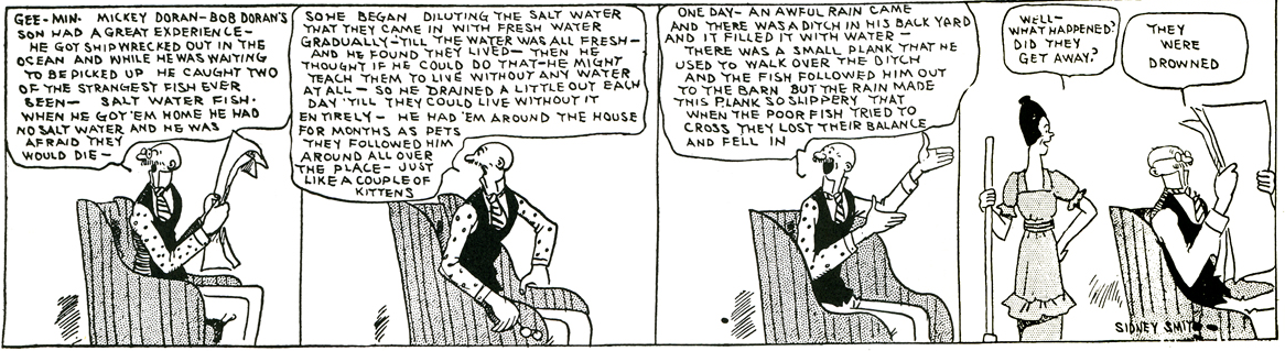 Before we get to Dorothy Parker, let’s have a look at The Gumps, created by Sidney Smith in 1917. Although that strip had plenty of slapstick, it was wordier than Mutt & Jeff and somewhat more realistic (Smith was the first cartoonist to kill off a regular character, in 1929–it caused a national outcry). An example of the strip from around 1920: