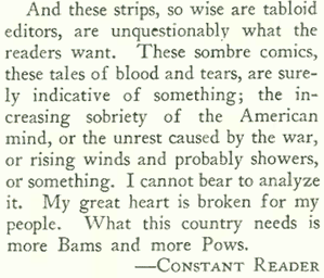 Parker suffered throughout her life from depression, and no doubt turned to the funnies for respite. However, she wrote that she hadn’t “seen a Pow or a Bam in an egg’s age,” and sadly concluded that melodrama was what the readers wanted.