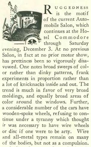 The New Yorker’s Nicholas Trott visited the Automobile Salon at the Hotel Commodore and noted that the latest trend favored an automobile’s “ruggedness” over its “prettiness.” Given the condition of roads in the 1920s, that probably wasn’t a bad thing…