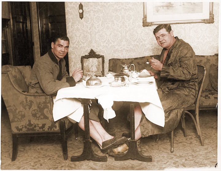 BREAKFAST OF CHAMPIONS…Babe Ruth having breakfast with his friend, heavyweight boxing champion Jack Dempsey, at Ruth’s residence at the Ansonia Hotel in New York City, 1927. Dempsey reigned as the champ from 1919 until 1926, when he was defeated by Gene Tunney. (captainsblog.info)
