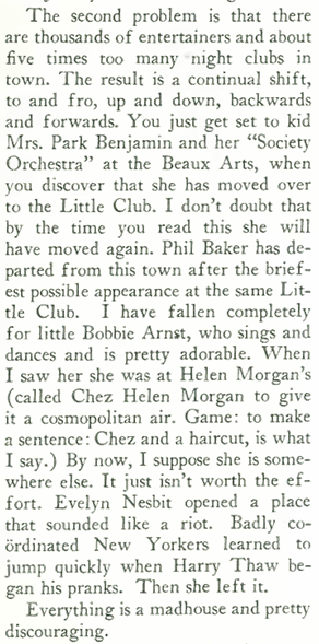 Before we jump to the ads, let’s look in on Lois Long, who in the Dec. 10 issue continued her lamentations regarding the quality of New York’s Prohibition-era night life and reminded readers that her job was far from a “soft snap”…