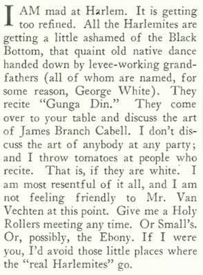 Long also railed against the white appropriation of Harlem entertainment, which she felt was draining the place of its soulfulness. In particular she called out writer and photographer Carl Van Vechten, who among white writers was the most prominent in intellectualizing the “Harlem Renaissance”…