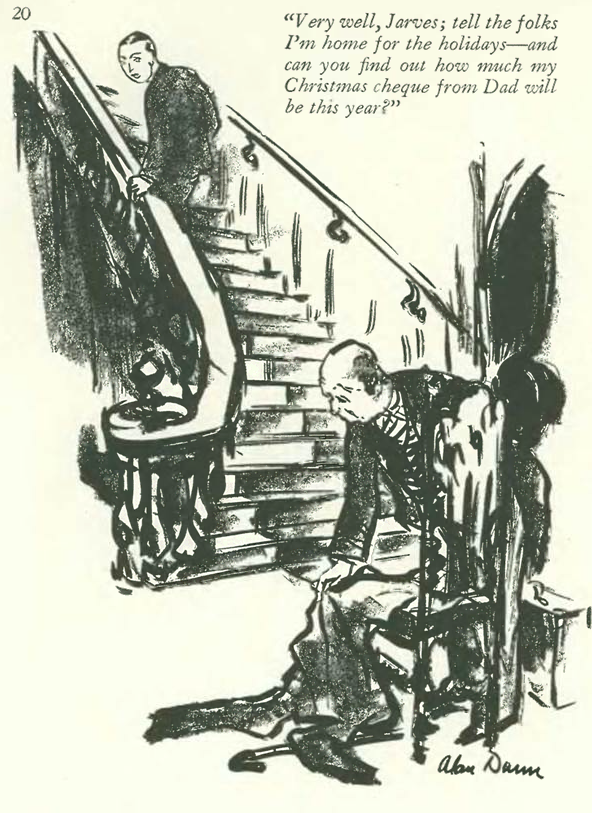 …and the same issue offers this glimpse into the life a spoiled rich kid, home from college for the holidays. The cartoon is by Alan Dunn, one of the most published New Yorker cartoonists (1,906 cartoons from 1926 to 1974)…