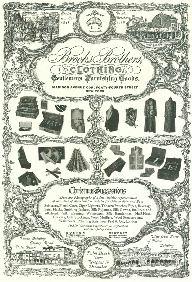 The Dec. 10 and Dec. 17 issues grew fat with holiday advertising, averaging 120+ pages as opposed to the usual 60 or so pages. The advertisements mostly appealed to upscale readers, ranging from this almost Victorian-style ad from the staid Brooks Brothers…