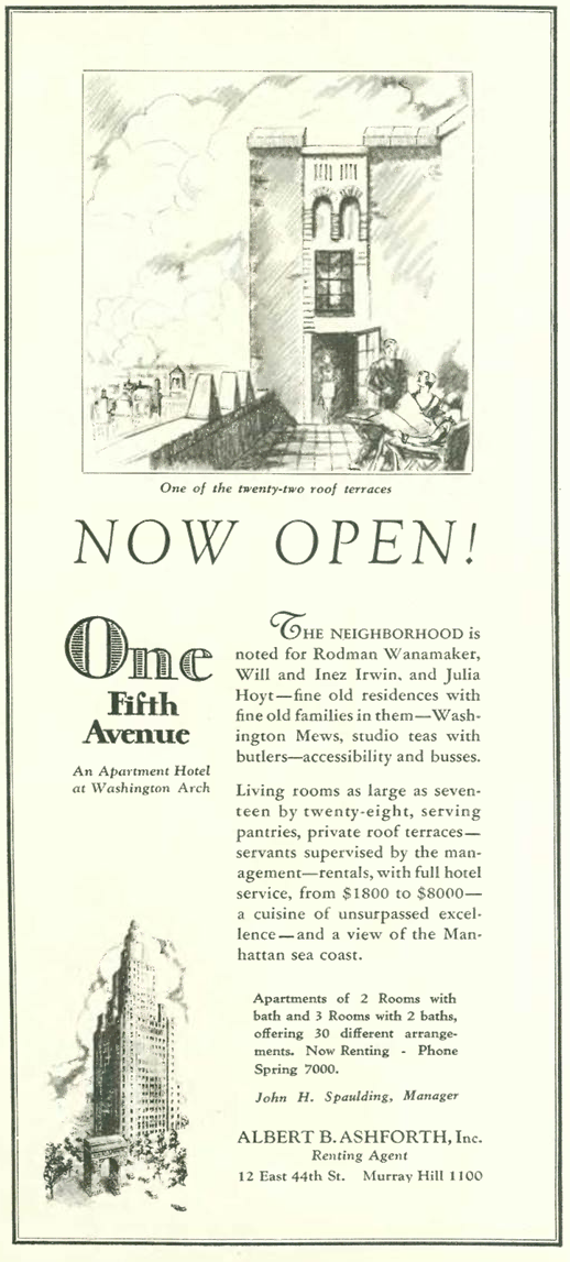 Historical note: One Fifth Avenue marked a dramatic change in the character of Washington Square, one of the most prestigious residential neighborhoods of early New York City. A previous occupant of the One Fifth Avenue site was the brownstone mansion of William Butler Duncan. In addition to One Fifth Avenue, the residences at 3, 5, and 7 Fifth Avenue were also demolished to make way for the new art deco “apartment hotel.”