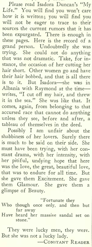 Dorothy Parker wrote a vigorous, even impassioned defense of the late dancer Isadora Duncan in her column, “Reading and Writing.” Parker reviewed Duncan’s posthumously published autobiography, My Life, which she found “interesting and proudly moving” even if the book itself was “abominably written,” filled with passages of “idiotic naïveté” and “horrendously flowery verbiage.” In this “mess of prose” Parker also found passion, suffering and glamour—three words that Parker could have used to describe her own life.