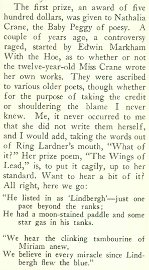 Parker’s comment about guiding a razor across her throat is a bit unnerving, considering she was chronically depressed and occasionally suicidal throughout her life. But then again, Parker didn’t like ugly things, including bad poetry, and especially bad poetry written by a twelve-year-old “prodigy,” in this case a one Nathalia Crane, who claimed the top prize in the Lindbergh collection. Parker observed: