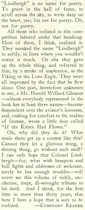 Parker observed that “Lindbergh” was not a name well suited to poetry, and concluded with the hope that the aviator would be spared from having to read the “sickly, saccharine, inept, ill-wrought tributes”…
