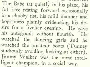 Instead, the Babe would have to listen to a surprise speech by Tunney, who sought to prove to those in attendance that he had brains to match his brawn. No doubt to the relief of many in attendance, New York City’s flamboyant mayor, Jimmy Walker, was able to return the proceedings to party mode.